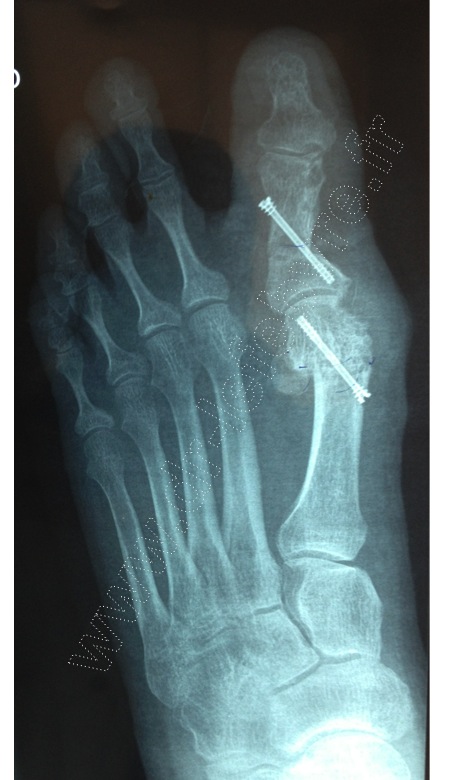 La chirurgie de l’hallux valgus consiste à réaxer le gros orteil par le fait d’ostéotomies du métatarsien et de la phalange. Cette correction d’axe facilite le chaussage en améliorant l’appui plantigrade au sol du pied à la marche et de ce fait les douleurs.